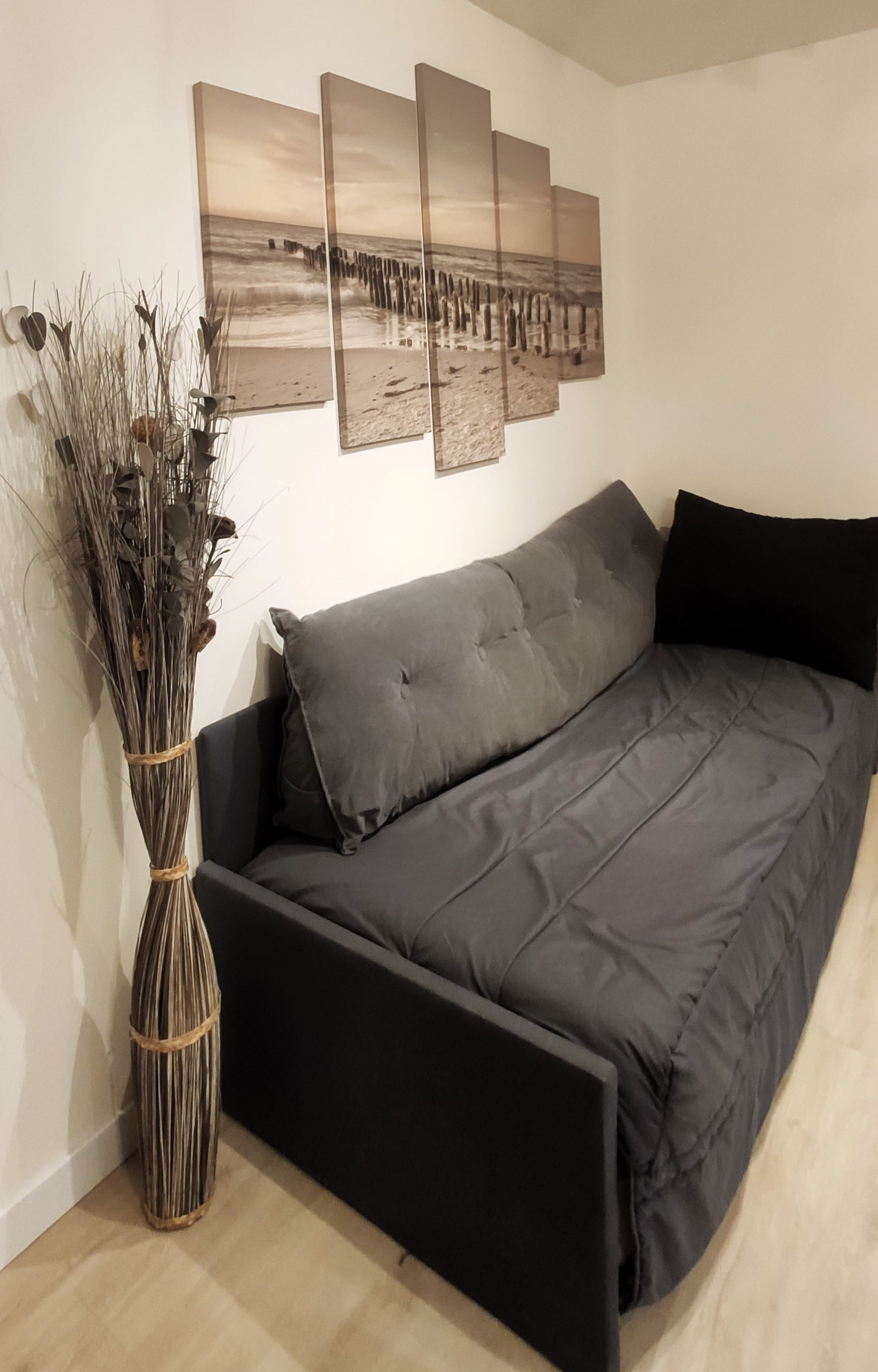 Canapé-lit de l’espace séjour avec son tableau décoratif.