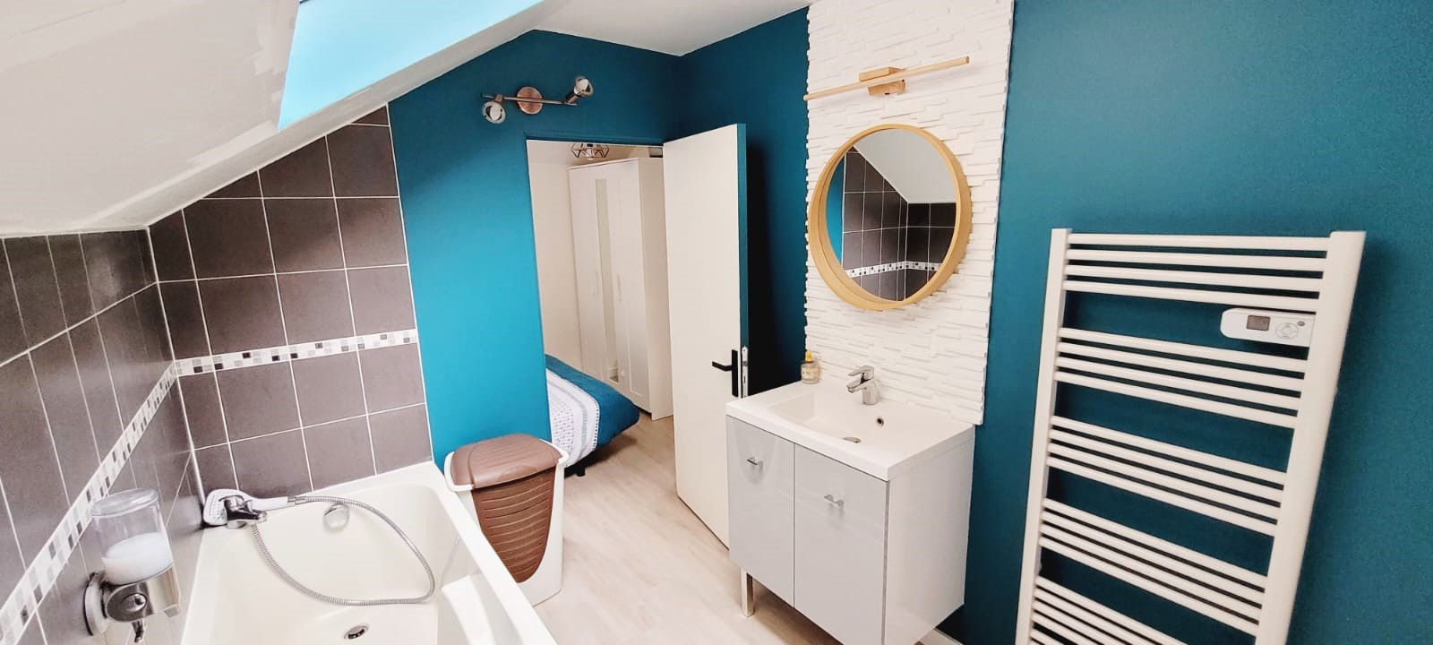 Salle de bain avec son lavabo, miroir et son sèche serviette appréciable pour disposer de serviettes de bain toutes chaudes à la sortie de son bain.